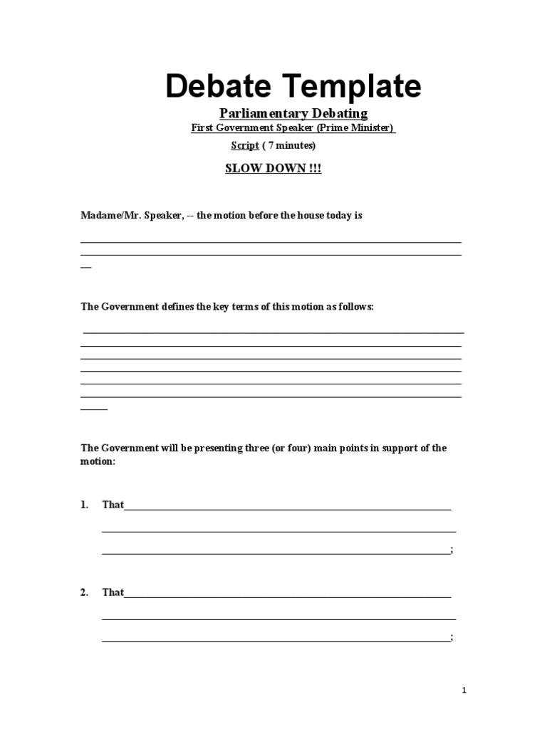 Debate script for prime minister. Before i put forward my case today i would like to define today s motion this house believes that. The opening prop speaker sometimes called prime minister has to define or interpret the motion. Debate speech template. Defines the motion states the case division split between the speakers produces his positive matter 2 to 3 arguments 1 sentence to state your position explain it further 2 major forms of support examples philosophical points quotes develop your arguments summarize this.