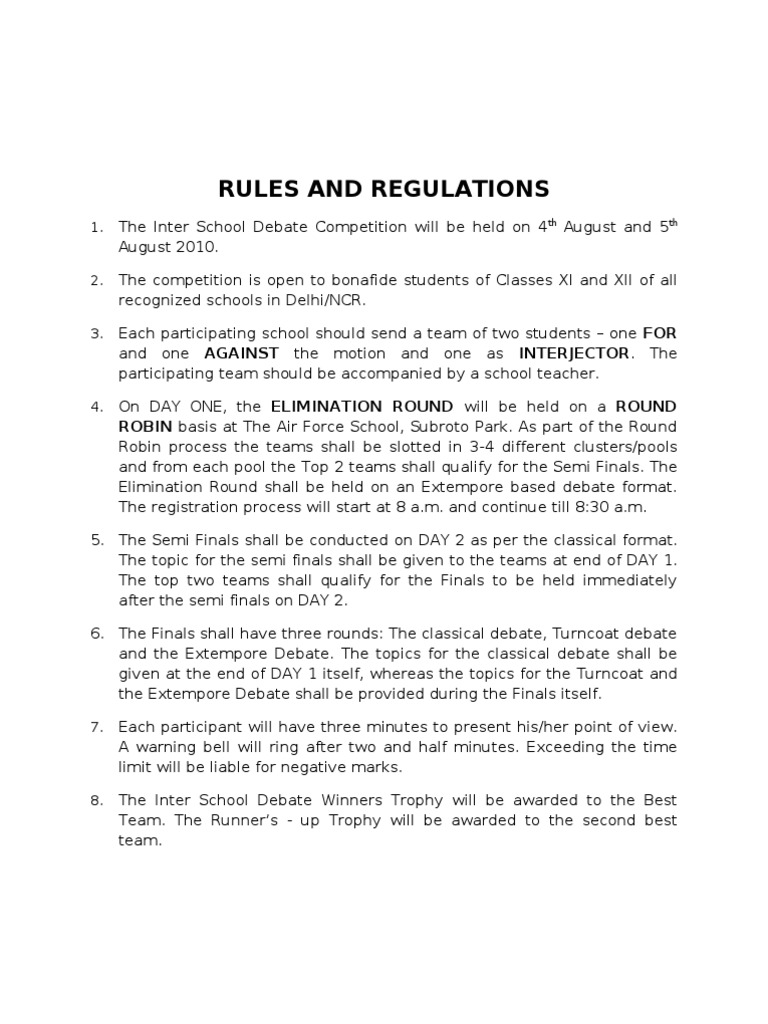 Rules and regulations for debate competition. Rules and techniques by george mccoy musgrave. Debate can be an effective instructional method for helping participants to present and evaluate positions clearly and logically. However matters relevant and material to the proposition areadmissible 2. General rules for debate competition rules and regulations.